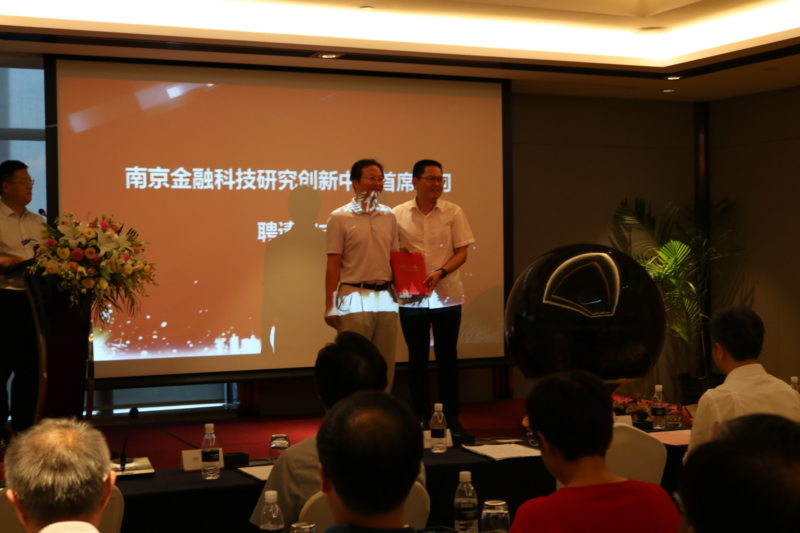 濮励杰为姚前颁发南京金融科技研究创新中心首席顾问聘书。