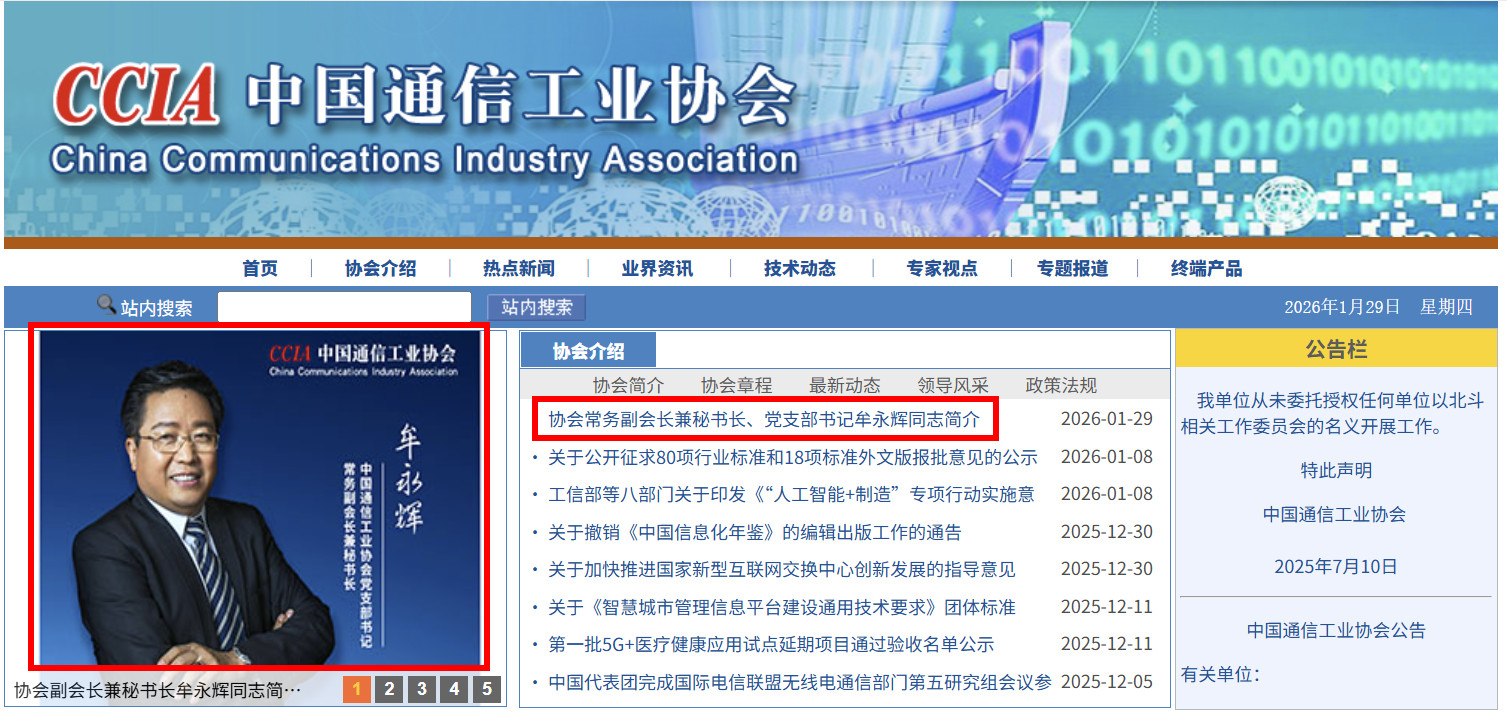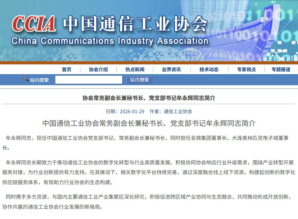 近日,中国通信工业协会迎来重要人事安排。牟永辉同志正式担任协会党支部书记、常务副会长兼秘书长三项核心职务,全面负责协会党建引领、战略规划与日常运营工作。与此同时,他将继续肩负名微集团董事长、大连奥林匹克电子城董事长等重要企业领导职务,持续推动产业服务与实体经济深度融合。